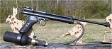 Continuous Air: An early Crosman 150 frame supports the single ring paintball tank mount. CO2 is transmitted directly from the tank to the Boss valve by pressure hose. |